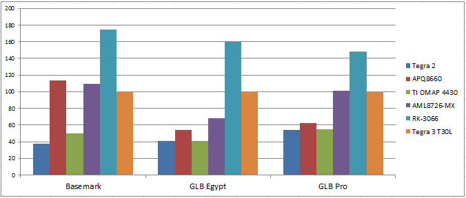 RK3066 has 33% faster total GPU clock speed over 8726-MX. That gives it a boost of about 33% more triangles/s.