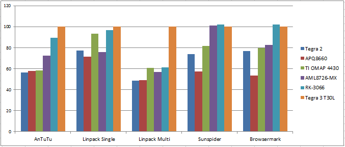 You can see that Nexus 7 has trouble in this bench too. That RK3066 does better than 8726-MX & Tegra3 (with 416 MHz ULP Geforce). That has to mean something about Tegra3 GPU. =) ie. lacking or weak on the shader side