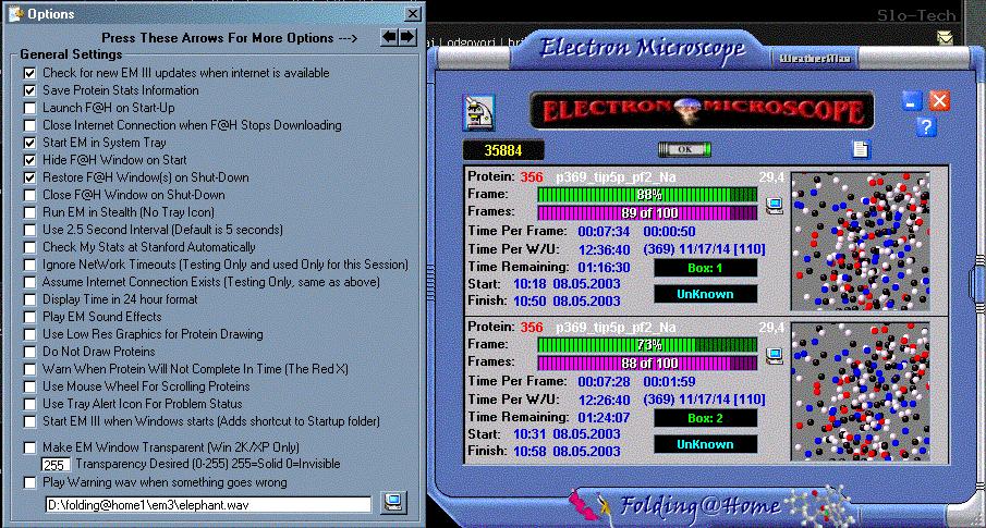 Jaz imam nastavljeno tako kot je vidno na sliki, bližnjico do EM3 imam pa prav tako postavljeno v startup pod fah_konzolami. Tako se mi vedno na startu zalaufajo konzole takoj zatem pa EM3, ki jih skrije (ter seveda tudi sebe) v systray. Tako da vse kar imaš je mikroskop ikonca tam, ki jo po potrebi odpreš če hočeš pogledat napredek.