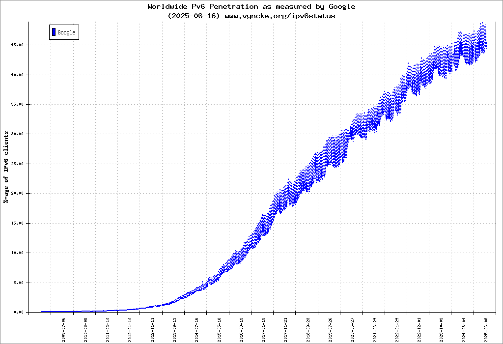 bo počasi 20% VSEH svetovnih uporabnikov (ne servisov). Za slednje je drug graf @> https://www.vyncke.org/ipv6status/