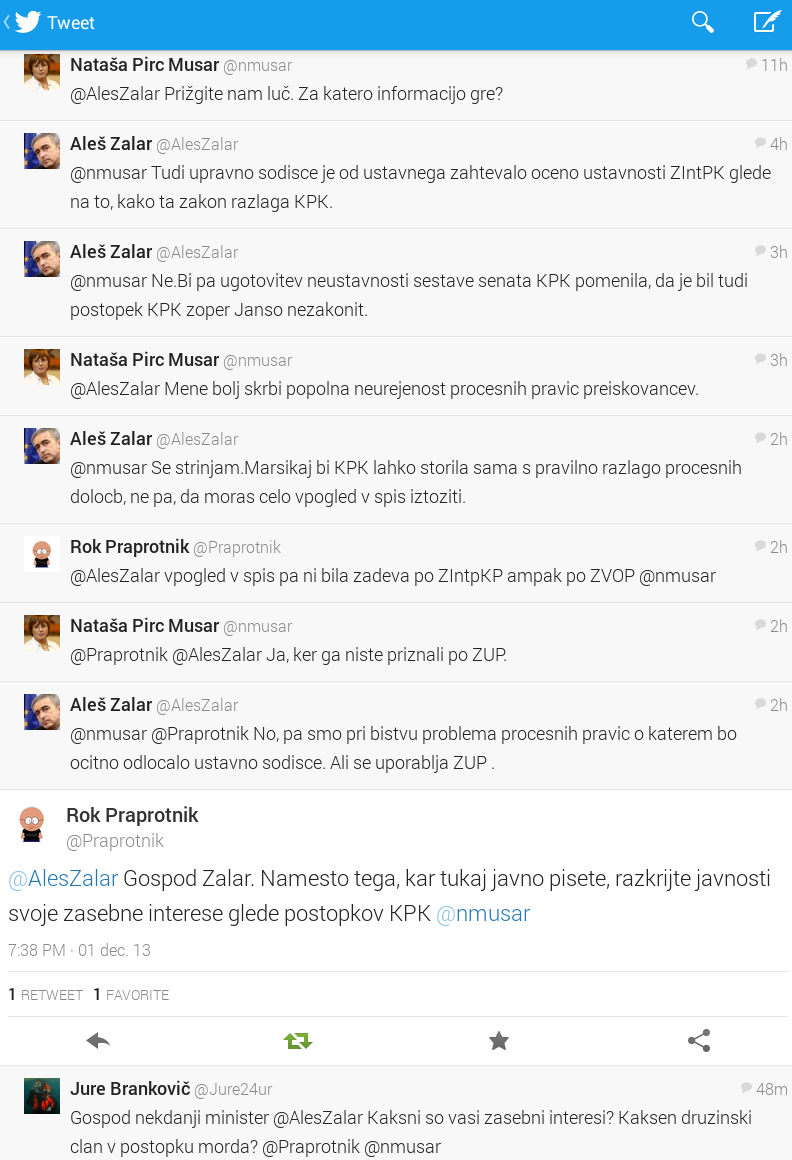 Mimogrede, Zalar zgleda kar navdušen nad odstopom KPK. Sicer v tvitih izraža skrb za JJ, kar je ganljivo in prepričljivo. NOT. Potem pa mu Praprotnik spusti manjšo kajlo. To postaja pravi Jerry Springer Show. Ne vem pa, zaradi koga je Zalar v resnici v skrbeh... Kresalove ali Jankoviča ali...?