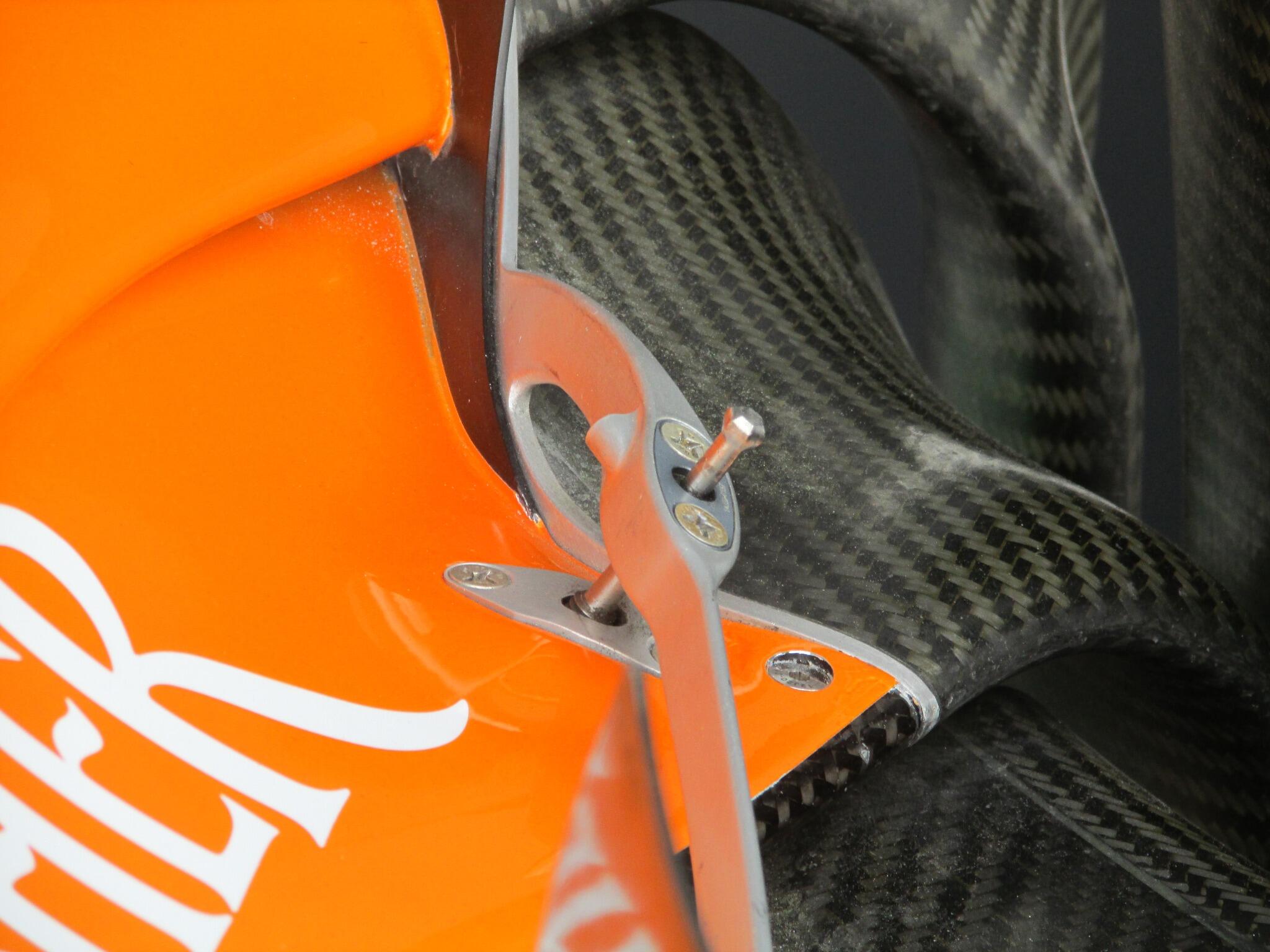 Pi***. Trenutek, ko je še lahko navaden šrajf, ki štela naklon polovičke prednjega krilca zanimiv. Polokrogla glava za dostop z gedorami tudi pod kotom (homokinetični zglob), kar pripomore  k neverjetnim neoviranim 2sec postankom. Ćlovek ne bi verjel kako malo (kot in površina)  ekipe nastavlajo prednje krilce. Tako dobiš tisto sliko, koliko dejansko postranska  je proizvodnja negativnega vzgona. Tukaj tiči daleč največ razlogov za namerne/nenamerne turbolence dirkalnikov.