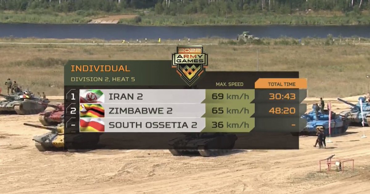 Final results in the division 2, crew 2 race from this morning. Zimbabwe had their time shortened as they were stopped for almost 20 minutes due to technical malfunctions with the T-72B3