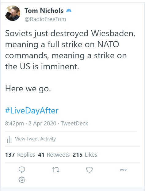 I had to delete this because people are dumb, panicky beasts. I mean, *all day* I've been saying I'll live-tweet THE DAY AFTER and it's pinned right to my profile, and yet people still think the "Soviets" destroyed Wiesbaden and the only guy who knew it was me here on Twitter
