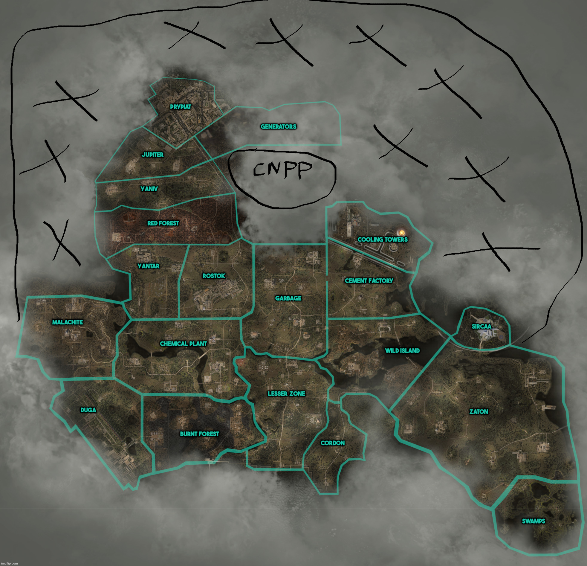 Manka pa tudi večje ozemlje severno od Zatona, sirce, Cement factory, Cooling torwers, Iron forest,, CNPP in Generatorjev pa tja, do Pripyata.