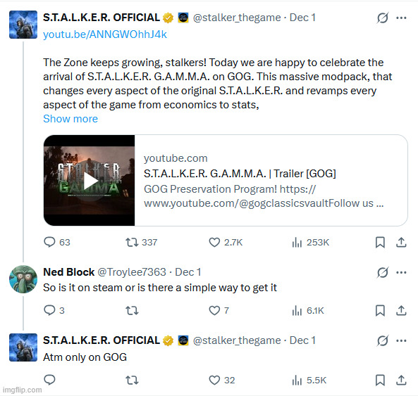 Smotano so naredili na GoGu ker moraš imet Call of Pripyat Enhanced verzijo kupljeno pri njih če sploh želiš potegnit GAMMA. Jaz imam vse na Steamu tako da zame ne bo nič iz tega. Mogoče pa jim kdaj uspe ruknit tudi na Stem, kdo ve.