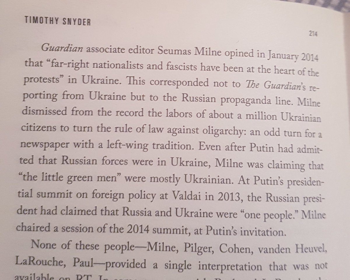 I'm sure you've all read Snyder's Road to Unfreedom but if you haven't boy oh boy. Look at how the left was seduced by Kremlin disinformation over Ukraine And look who reinforced the message. I wonder what happened to Seumas Milne... oh yes The long hard fall of John Pilger in my estimations over the course of my adult life has been deeply depressing.