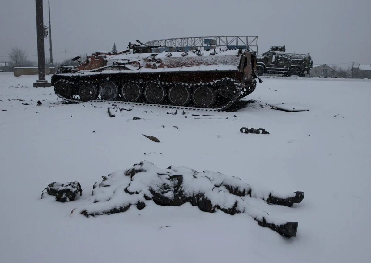 The body of a Russian soldier lies next to a Russian vehicle, in Kharkiv, Ukraine, on Friday.