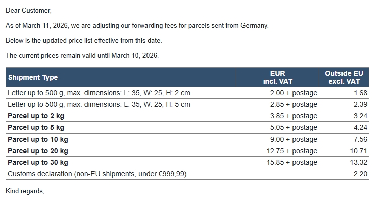 As of March 11, 2026, we are adjusting our forwarding fees for parcels sent from Germany.