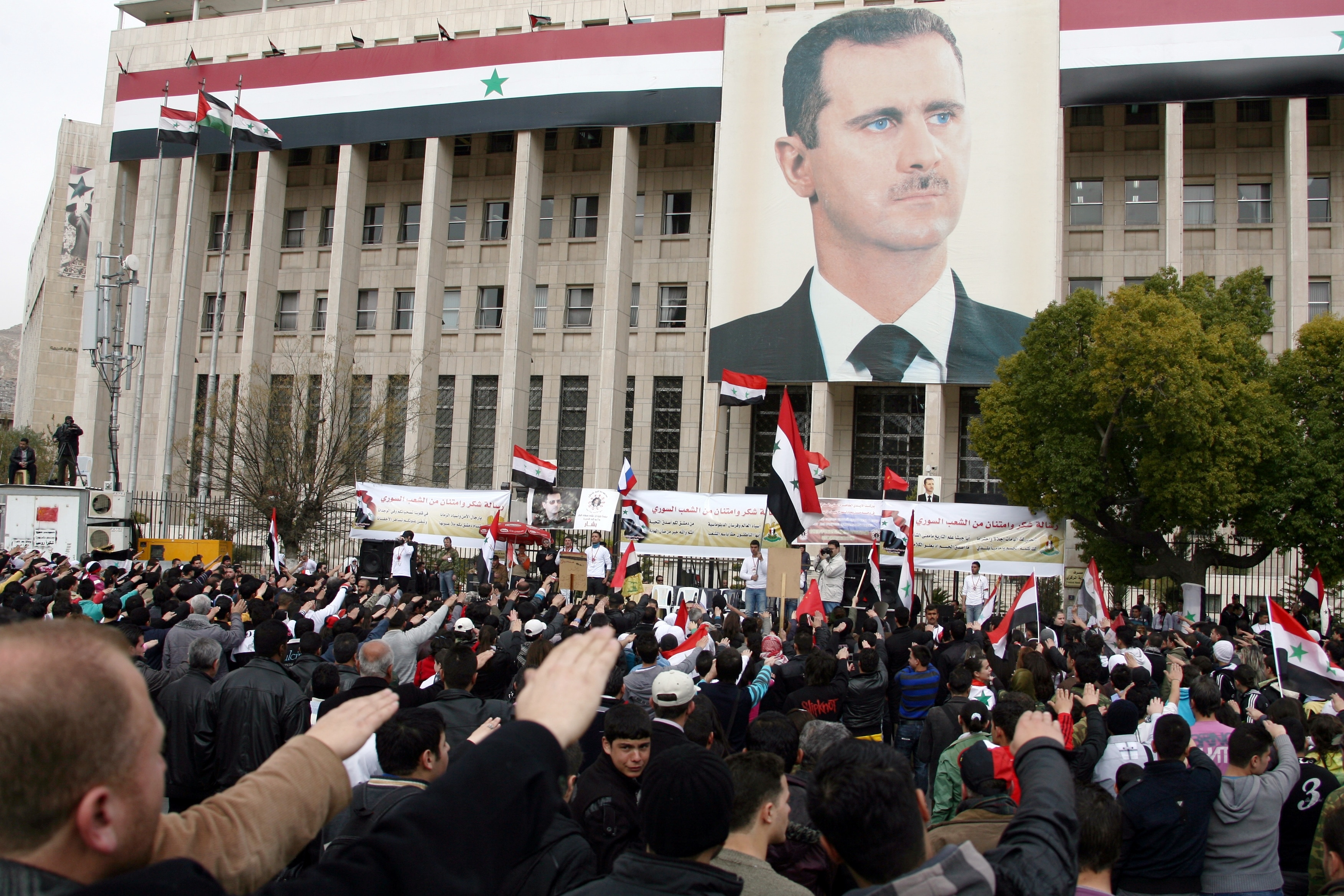Pomagaj mi razumeti - imamo sliko, kjer pozdravljajo Assada na provladnem zborovanju, ker jim je obljubil novo ustavo, ki bo ukinila diktaturo, in to je dokaz, da so nacisti? Ker njihov pozdrav izgleda podobno, kot pozdrav norcev pred več generacijami, na tisoče kilometrov stran?