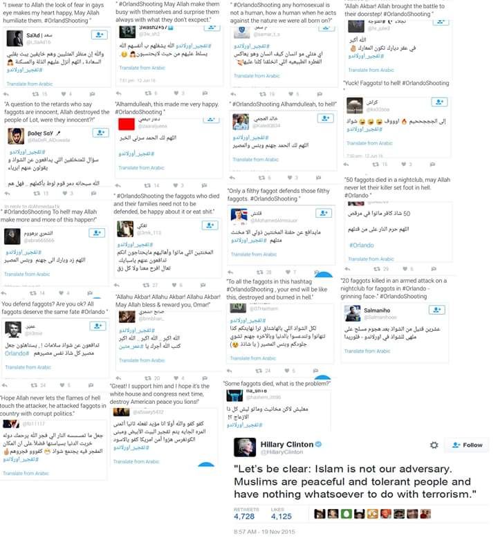 To prevedeno pomeni, da pri teh extremnih izgredih ne gre samo za mavrične. VSA hujskanja .....in smo videli že proti nevernikom, pa kristjanom itd, ...je treba pregnati vsaj iz mošej na Evropskih in USA tleh. Ostale akcije kot so bombardiranja ISISA in podobne pa že tečejo vedno bolj intenzivno se zdi.