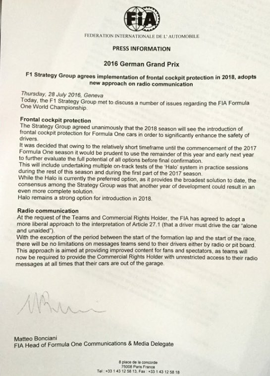 Odločitev za prepoved je prišla ravno zaradi dirkačev kot so recimo Rosberg (ironija, knede ...), zato ker mu je inženir dajal zelo podrobna navodila, kje zavirat, katera prestava itd. To je sporno, drive coaching.
