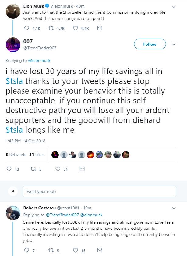 Tesla mu je ogromen dobiček (vsaj teoretično). Leta 2012, ko je Elon napisal, da "nima nič proti shortsellerjem" je njegov delež v Tesli bil vreden ~$700m miljonov. Sedaj, ko "sovraži shortsellerje" je njegov isti delež v Tesli vreden ~$10 miljard.