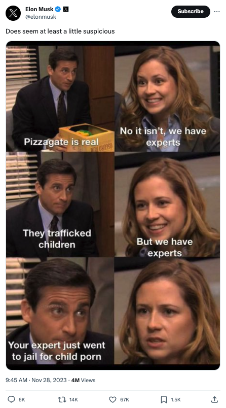 How funny would it be if Elon Musk becomes a pizzagate guy