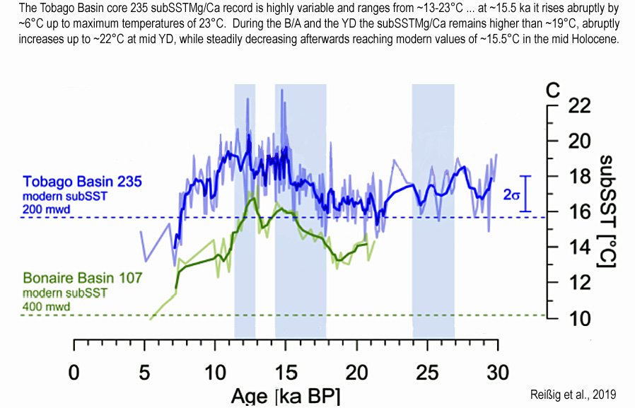 A new tropical Atlantic subsurface temperature reconstruction indicates it was 7°C warmer than today during the Younger Dryas/Bolling-Allerod (~15,000-11,500 years ago), when CO2 concentrations hovered around 210-220 ppm.