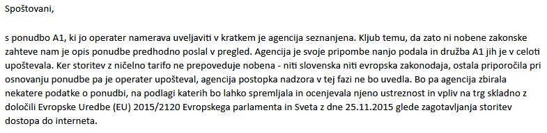 AKOS ni kriv za vse. AKOS je par let nazaj lepo utemeljil, kako si predstavlja nevtralnost interneta, pa je sodisce to razveljavilo (https://slo-tech.com/novice/t678632#crta ). Po razlagi sodisca menda za krsitev nevtralnosti ni dovolj, da se dolocenega prometa ne obracunava, ampak je potrebno omejevati promet na tehnicnem nivoju. Kaj naj potem naredi AKOS in kaj pomaga sklicevanje na EU uredbe itd. AKOS pac ne more delovati v nasprotju s sodno prakso.