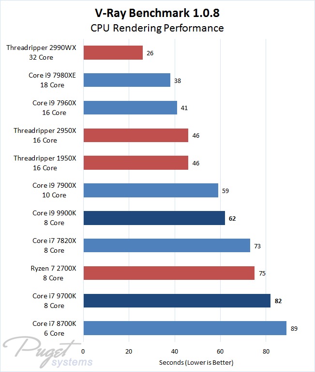 Tudi v renderiranju, ki enakomerno obremeni vse niti, je 9700K hitrejši, kljub manj nitim: