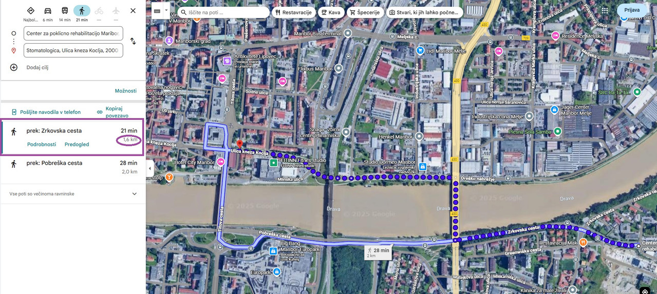 Najbližja pot je do dvoetažnega mosta, ga prečkaš in greš proti festivalni dvorani Lent. Na ulici Kneza Koclja (v bližini je trg Leona Štuklja) pa se začne center. Google kaže 21 minut.