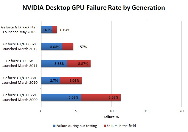 Tole je že par let staro (ene novejše, ki sem jo bral pred kakim letom sedajle na hitro ne najdem), ampak se lepo vidi, kako so se fail-rati pri Nvidii konstantno zmanjševali, pri AMD-ju pa vmes malo padli, pri R9 pečkah pa spet poleteli v nebo. Situacija je danes še kvečjemu bolj v prid Nvidii...