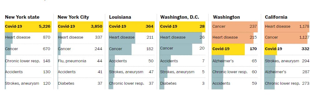Rdeči stolpec - število mrtvih zaradi Covid-19, modri stolpci - število mrtvih zaradi drugih vzrokov, najvišji so srčnožilne bolezni