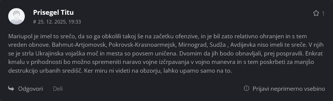 Pač tko je. Mariopulj bo temeljito obnovljen, ker predstavlja obrambo koridorja do Krima. Zato noben ne bo vprašal kolko košta ta obnova. Drugi problem je Zaporožje. Medtem ko ukrajinci sajajo o Kupjansku, jim preti, da se jim bo podrlo celo Zaporožje. Če pade Gujlajpolje, zna bit tam celi cirkus. In padlo bo. Potem bojo rusi vmes med tistimi lepimi fortifikacijami začeli prodirati proti mestu Zaporožje. Do tam je 65 kilometrov iz te smeri in 20 z južne, kjer se tudi počasi melje.
