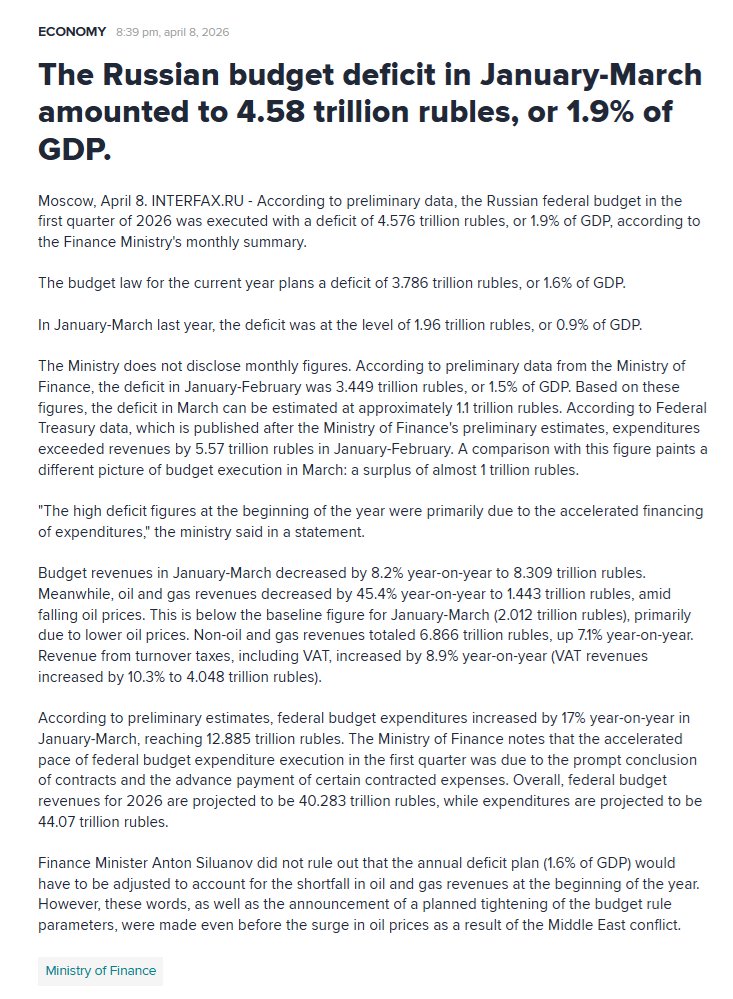 The Russian budget deficit for Q1 2025 rose to 4,576 trillion rubles or 1,9% of GDP up from 3,449 trillion rubles for January-February 2026. For Q1 2025 the deficit was only 1,96 trillion rubles. The planned deficit for 2026 as a whole is 3,786 trillion rubles.