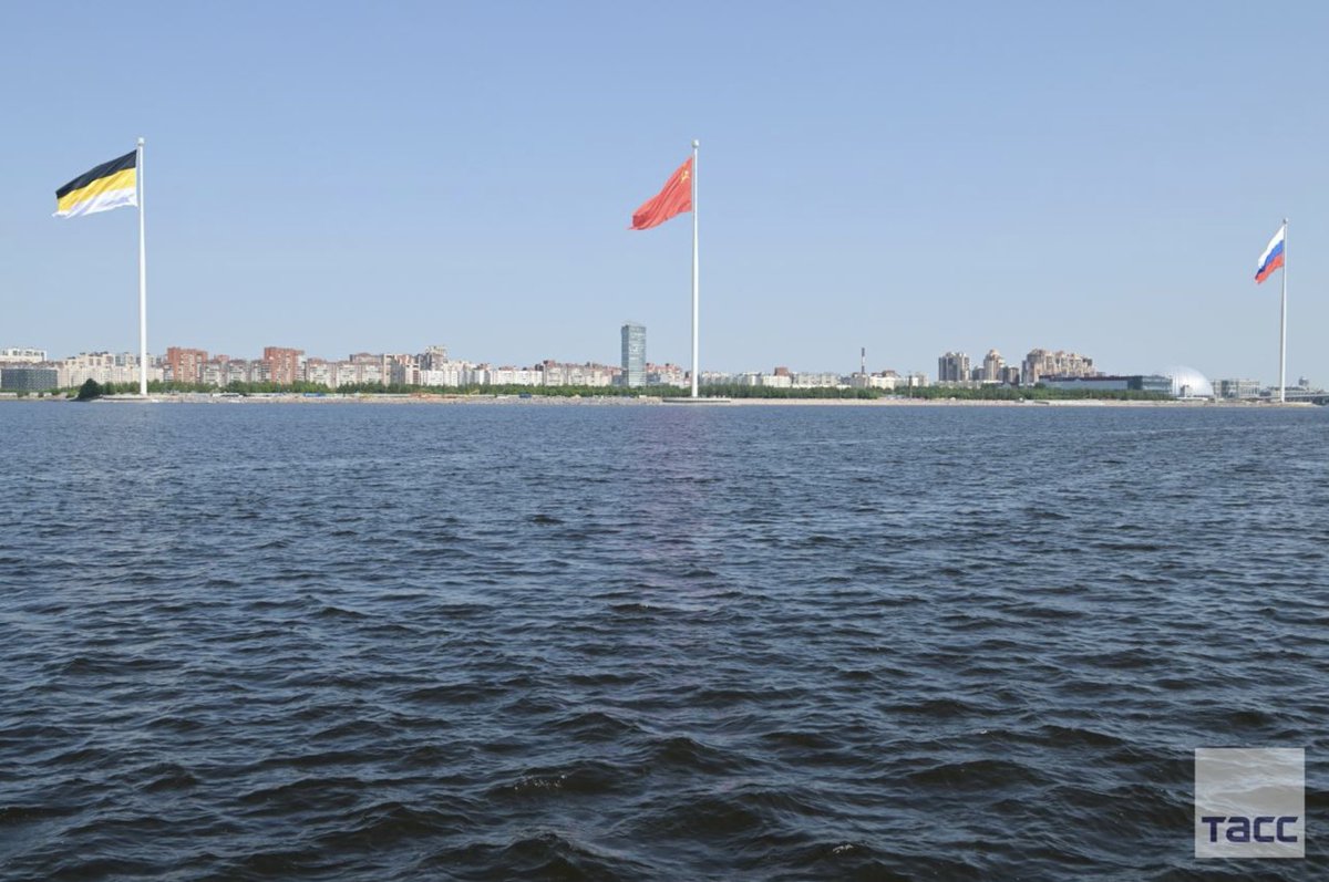 Imperial dreams. Putin watches as Gazprom raises above St Petersburg the giant flags of the Russian Empire and of the Soviet Union.