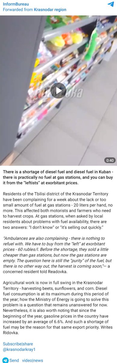 Russia has serious fuel shortages affecting food production. Agriculture minister pushes for priorization of field work or it's a disaster.