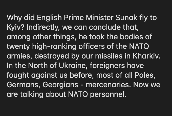 According to cretin Sladkov, Rishi Sunak came to Kyiv to collect the bodies of "20 high-ranking NATO officials killed in Kharkiv strikes".