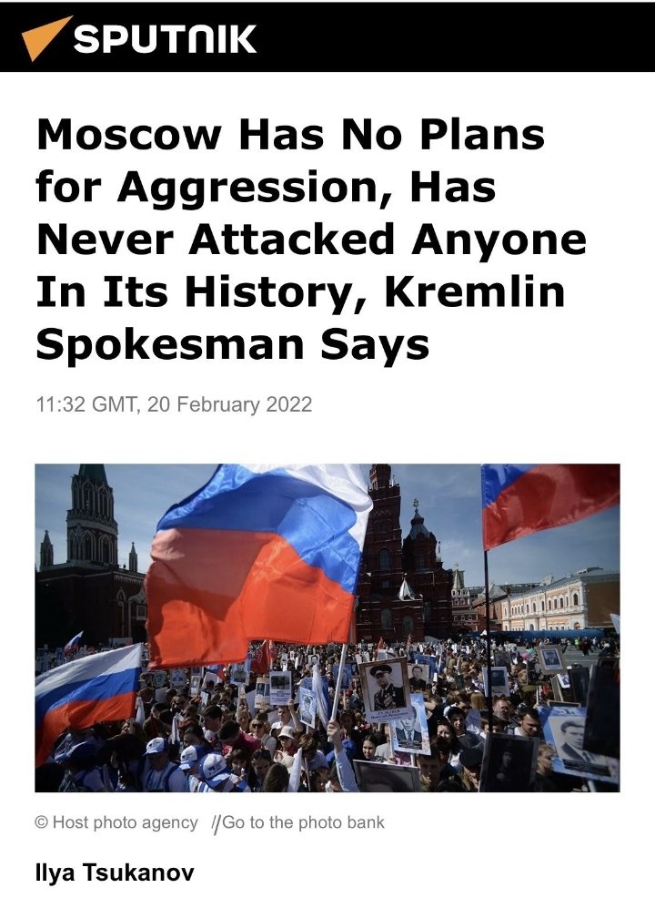 "We are calling for reason. We are urging [the West] to ask itself the question: What point would there be in Russia attacking anyone? We urge you to remember history. Let's just say that, as we have seen recently, the West isn't very good when it comes to history. But we remind you that Russia has never attacked anyone throughout its history," Peskov said in an interview on Russian television on Sunday.