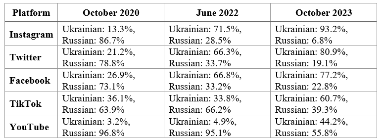 Kako je ruski ekspanzionizem uničil vpliv ruskega jezika in kulture v Ukrajini. Center za analizo vsebin prikazuje razmerje med objavami v družbenih medijih, ki prihajajo z ukrajinskih računov v ukrajinskem in ruskem jeziku od leta 2020.