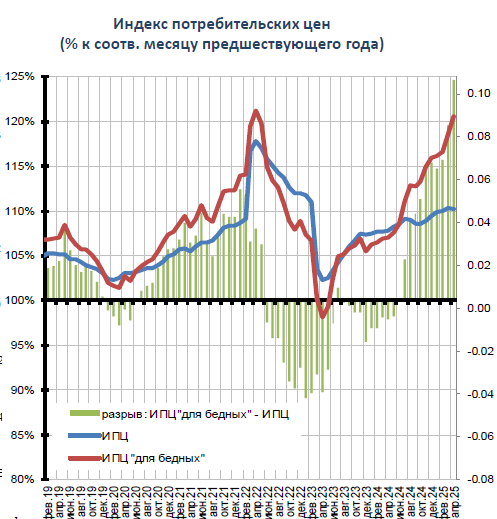 Inflacija za revne prebivalce Rusije (rdeča črta) je skoraj dvakrat višja od splošne inflacije (modra) in presega 20 %, saj so se cene hrane letos močno zvišale. Ker so pokojnine indeksirane le glede na splošno inflacijo, to pomeni, da se dohodek večine ruskih upokojencev zmanjšuje.