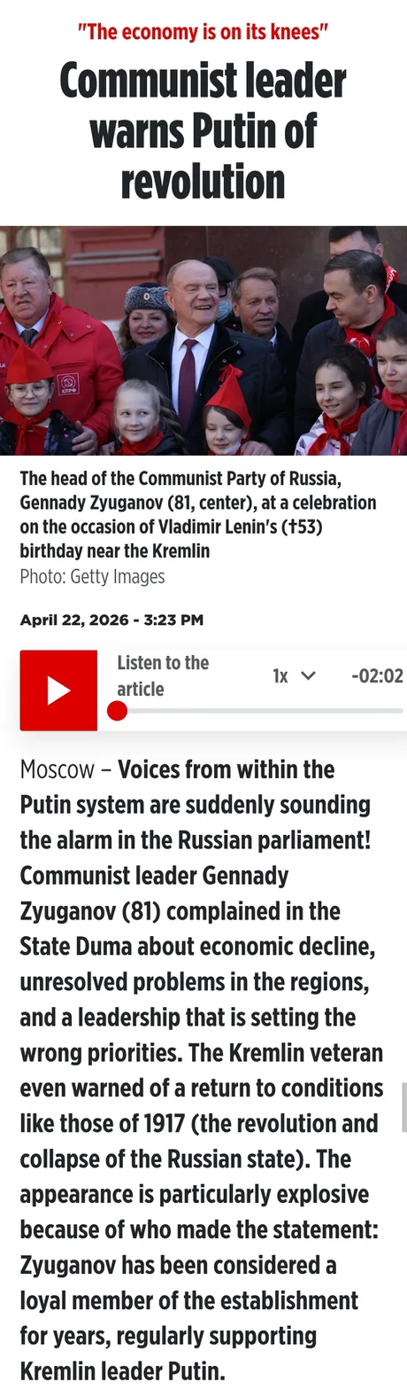 "The President recently convened a cabinet meeting...," Zyuganov told the lawmakers of the State Duma, "and said that an economic collapse is inevitable. The first quarter was a complete disaster. If you don't take urgent financial and economic measures, then in the fall we'll face what happened in 1917. We have no right to repeat that!"