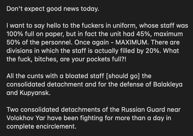 Another Russian channel says “don’t expect good news today” before saying Russian units there are below 50% manning levels while the staff are bloated. Two Rosgvardia detachments have been fighting for more than a day encircled near Volokhiv Yar.