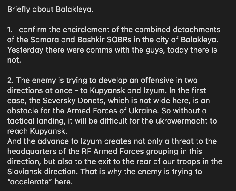 Numerous other Russian sources are confirming this, and are claiming that a detachment of Rosgvardiya SOBR spetsnaz managed to get themselves trapped in the Balakliya encirclement...