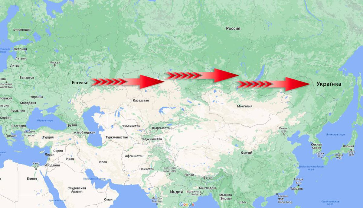 Potential route of the russian strategic aviation: from “Engels-2” airfield in Saratov region, west russia to “Ukrainka” airfield, Amursk region, far east russia.