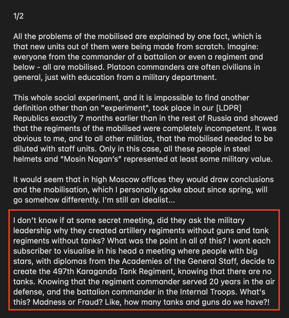 Debate on the success of mobilisation in the Russian channels today reveals some hilarious details: Vladen T. questions who in Moscow decided to create tank regiments without tanks, mobile battalions with a single truck, and infantry units with only assault rifles.