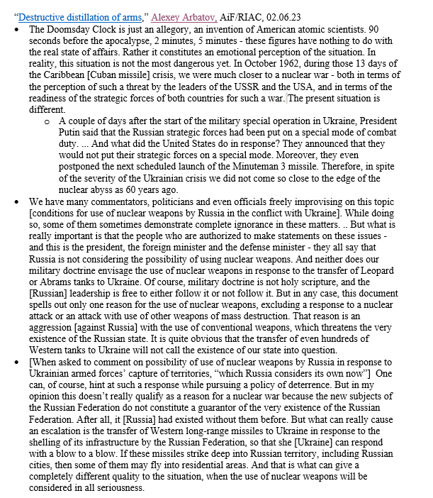A must read: One of Russia's most thoughtful experts on nuclear arms, Alexey Arbatov, has weighed in on scenarios for use of such arms and red lines, criticizing 'ignorant' RF pundits for improvising on such deadly serious issues. My rough translation of key points below: Link to the full text of Arbatov's interview to AiF in Russian language: