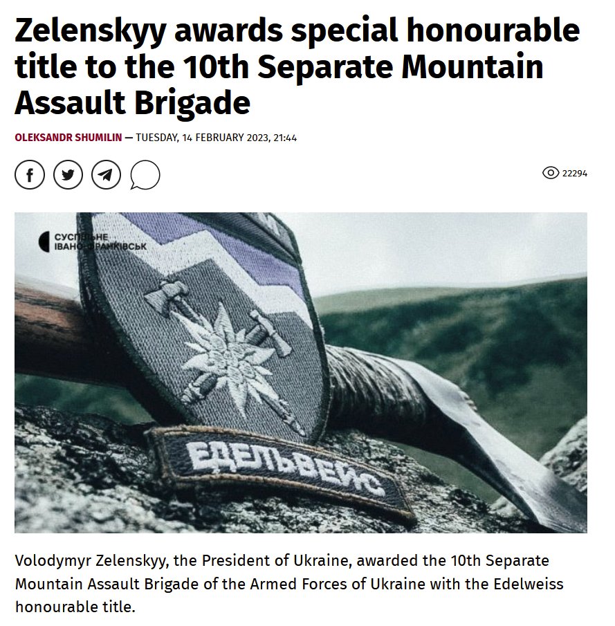 On 14 Feb 2023, president Zelenskyy awarded the unit with a honorary title "Edelweiss". This immediately got the attention of Russia's propagandists, trying desperately to connect it to Nazi Germany.