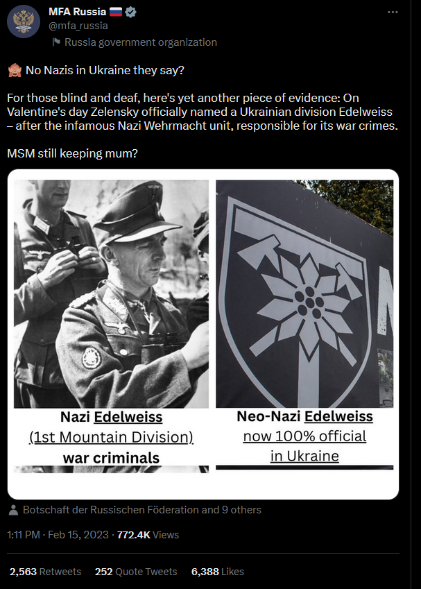 In today's #vatnik soup and the edition of "You pronounced this nonsense, not me", I'll discuss the rather novel "Edelweiss neo-Nazi unit" narrative that was also repeated in Putin's speech of 21 Feb, 2023.