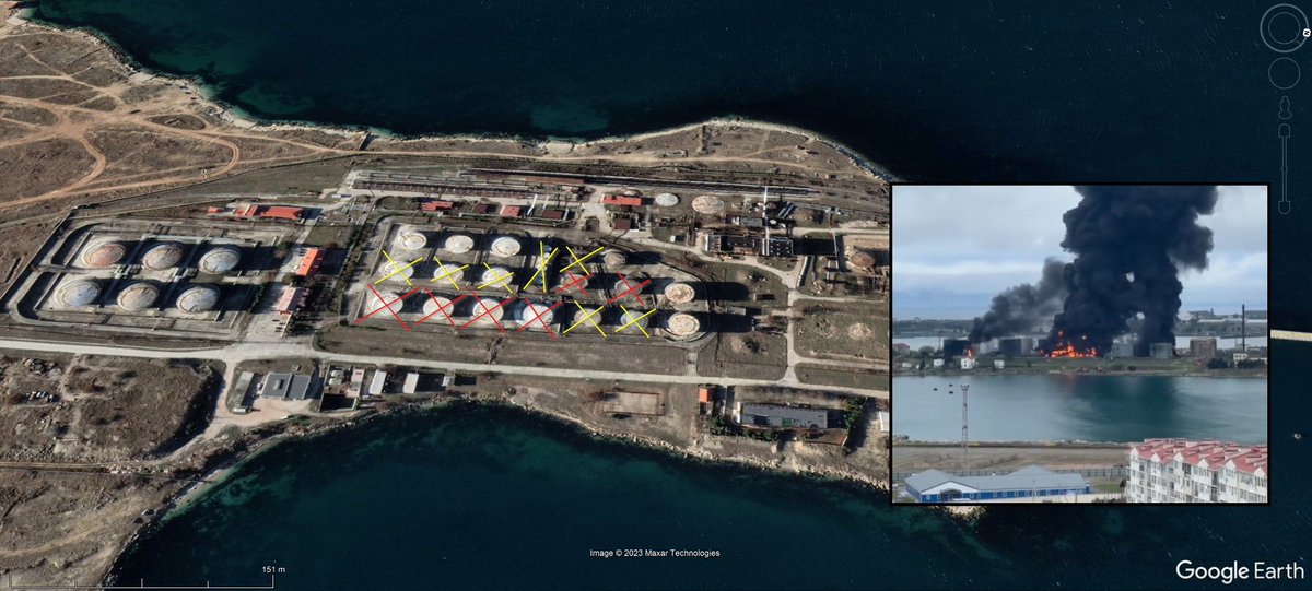 Tako na hitro z Google Earth so tole edini rezervoarji v Sevastopolu, dober kilometer zahodno čez zaliv je pa vedno prazno vojaško letališče. L. 2019 so tam zgradili 140x100 m veliko betonsko ploščo in gor postavili kontejnerje v puščavski barvi. Logistična baza za Sirijo?