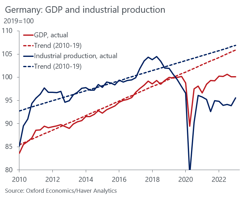 Germany is in search of a new growth model, as the previous growth driver - its industry - has been in secular decline since 2018. German industrial output is now down by over 10% relative to 2010-19 trend. No wonder alarm bells are ringing and subsidies are cooking in Berlin...