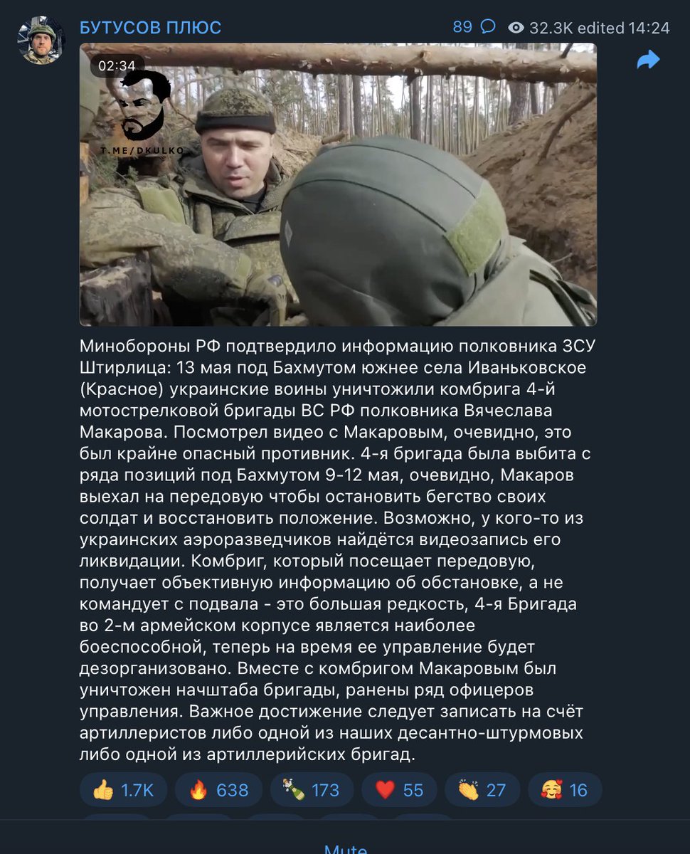 Ukrainian military reporter Butusov on demilitarisation of the 4th Brigade commander, Vyacheslav Makarov: "he was an extremely dangerous enemy...an important achievement for the [Ukrainian] artillery or assault brigade".