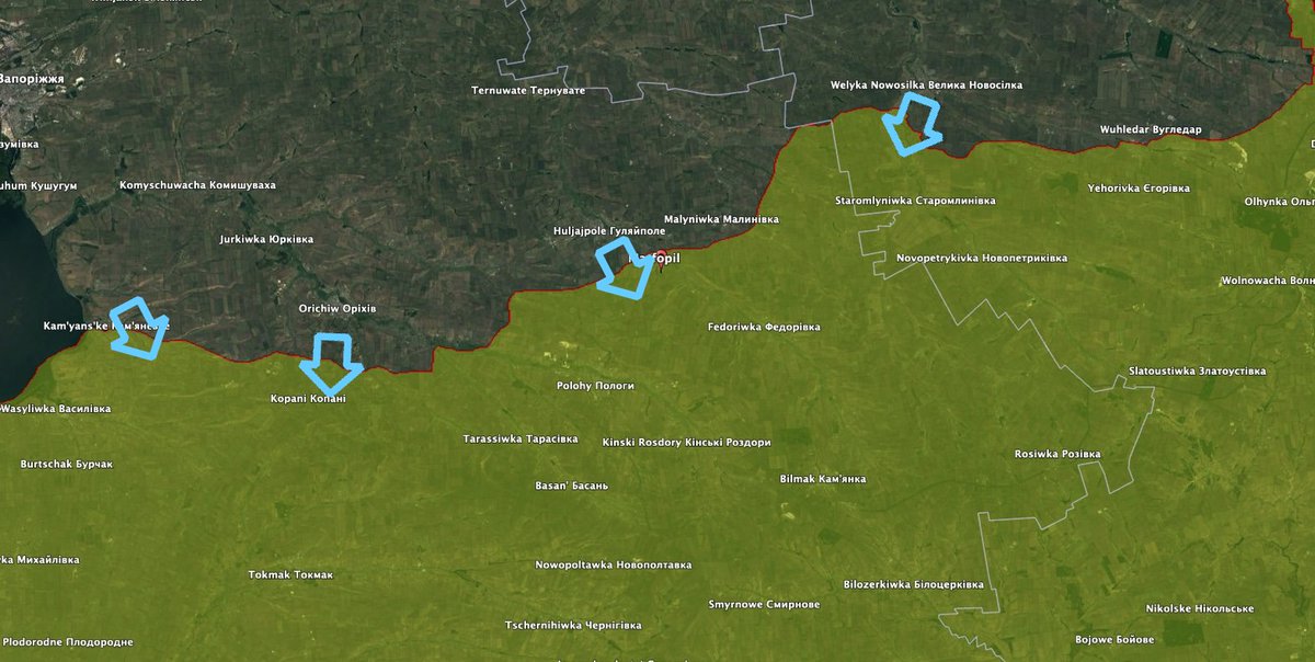 Meni je pa zanimiv prodor pri rezervoarju, tam noben ne pričakuje kakšnih premikov, je pa zanimiva opcija, proti nuklearki in nato do (Tokmak pa še bolj levo, Melitopol ali pa celo Krim).