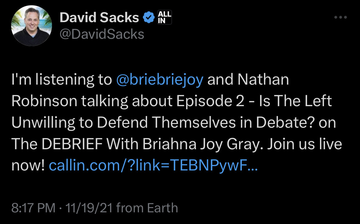 @DavidSacks constantly praises public figures willing to debate their views and disparages anyone who won’t.