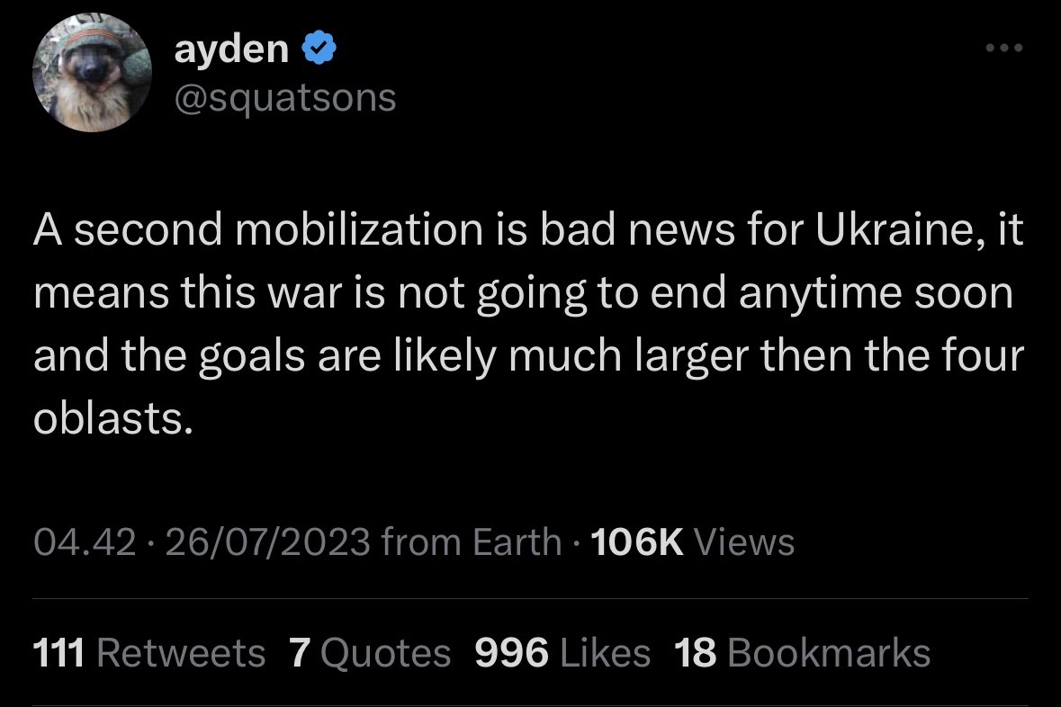 Ah yes, it is clearly great news for Russia that its short “Special Military Operation” is reaching a point where it requires a second mobilisation.