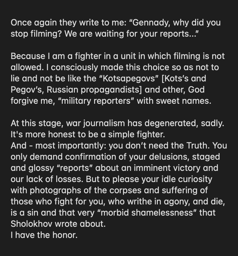 Quite notable is the message he posted on his Telegram just a few days before death where he openly said he was a combatant, and cast a shadow on other "military reporters", including Slakdov, Kots and Pegov. He said that the Russian audience only wants glossy reports about imminent victories, so in this sense, just saying that you're a fighter is more honest.
