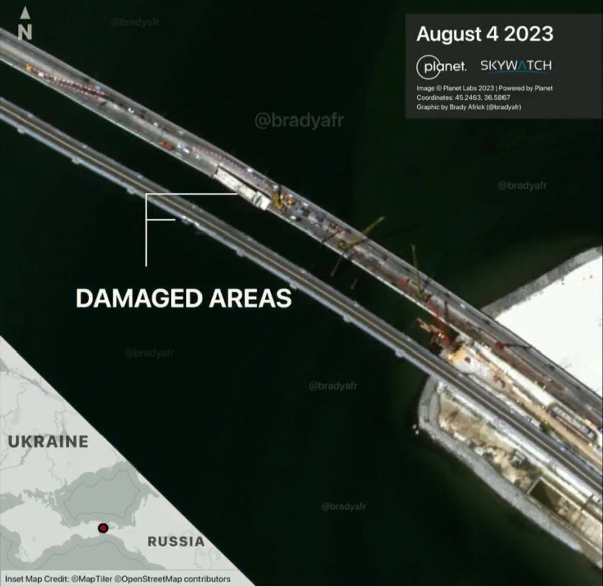 The span of the north side of the road bridge has disappeared. It is unclear whether this was due to construction progress or an accident. There were no reports of attacks. During the last attack, the southern side span was damaged (see photo from August 4)