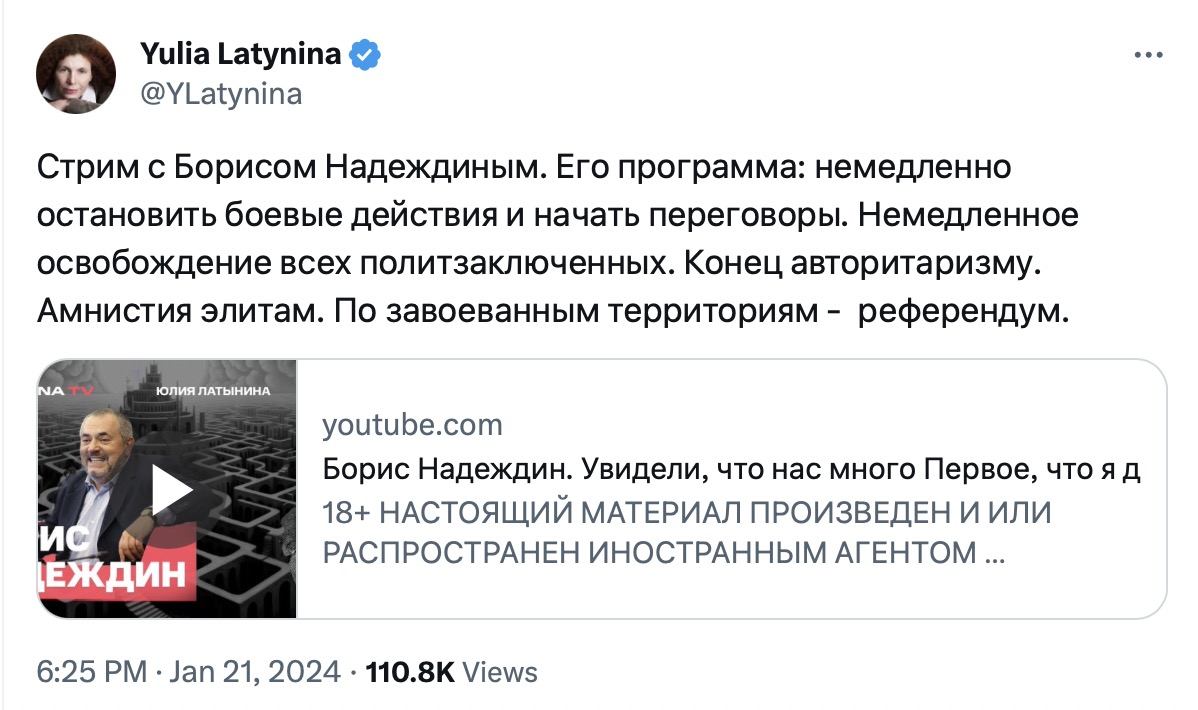 In his interview to Russian liberal imperialist Latynina Nadezhdin confirmed, that he wants to have a cease-fire, negotiations, and a "referendum" in Russia-occupied territories. This does not differ to Putin's position.