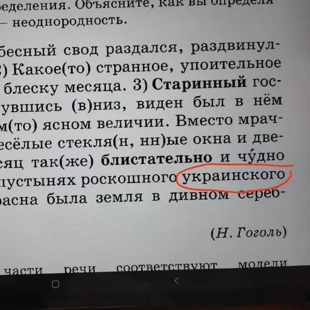 It's the final passage of the tale "May Night, or The Drowned Maiden" by Gogol (1831). In English it reads: "Only the moon hung, as brilliant and wonderful as before, in the immensity of the Ukrainian sky." The putinskaya version changed it to "...in the immensity of the sky."